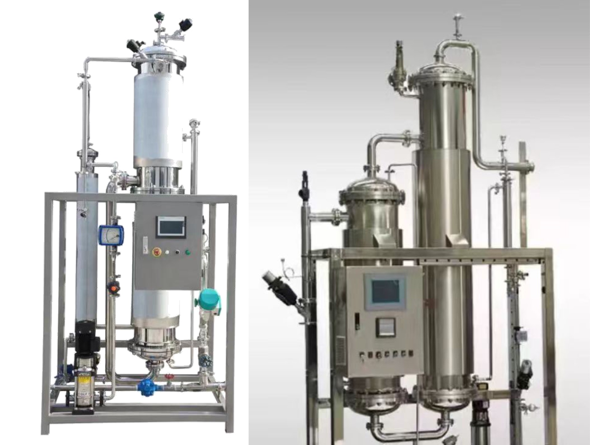 纯蒸汽发生器由蒸发器、预热器、电气自动控制部分组成。为确保纯蒸汽质量,蒸发器采用独特的三级分离方式:即升膜蒸发重力沉降螺旋分离。
